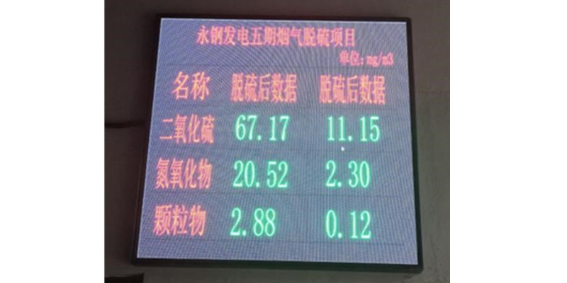 公司EPC總承包的聯(lián)峰鋼鐵有限公司電力廠5#煙氣脫硫項(xiàng)目自投運(yùn)以來,通過對鍋爐煙氣脫硫前后參數(shù)的采集與對比,對脫硫劑小蘇打的噴吹量實(shí)現(xiàn)自動調(diào)節(jié),經(jīng)過一個月的調(diào)試,除塵器出口煙氣含塵顆粒物、SO2,氮氧化物的含量均低于國家超低排放行業(yè)標(biāo)準(zhǔn),達(dá)到公司承諾運(yùn)行保證值,滿足性能考核要求。脫硫后的排放數(shù)據(jù)實(shí)時顯示到大屏,對外公布。