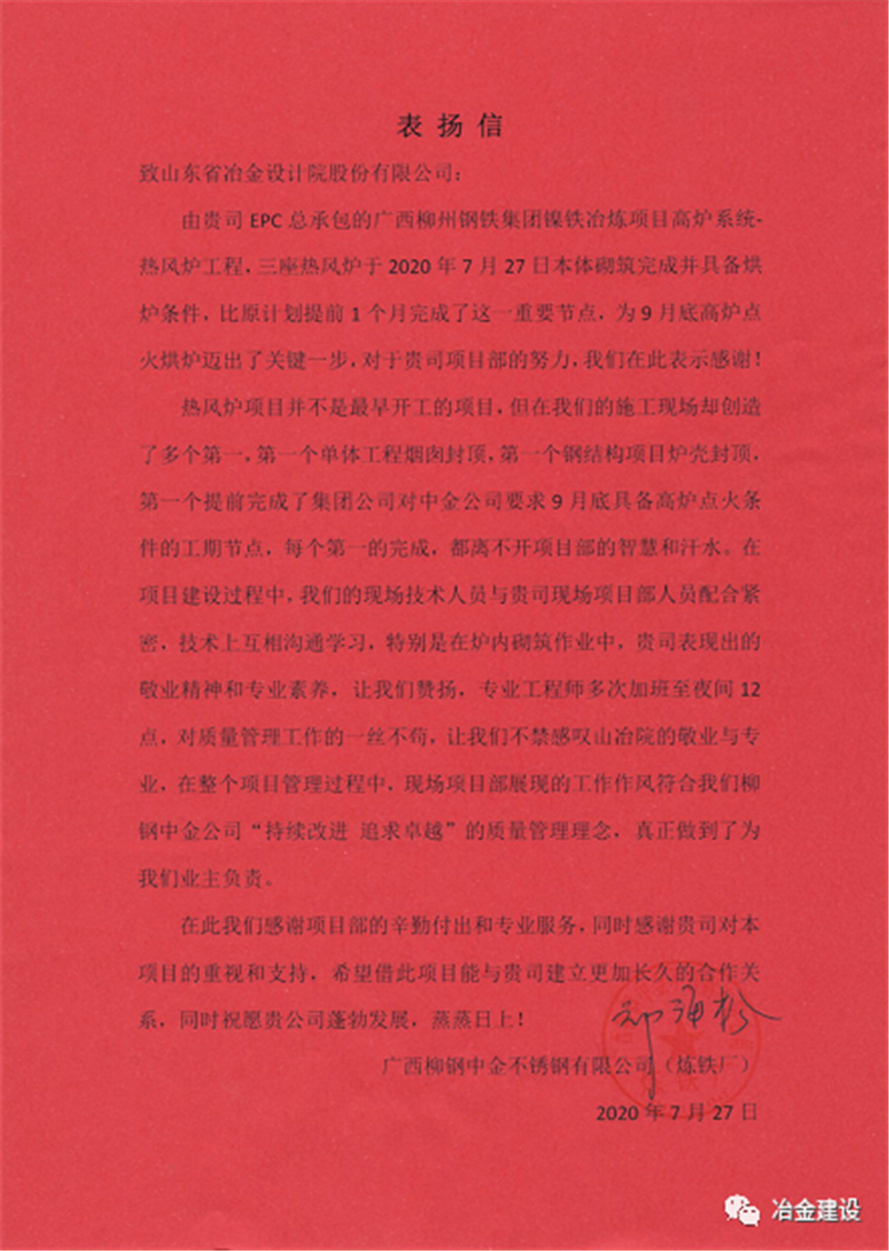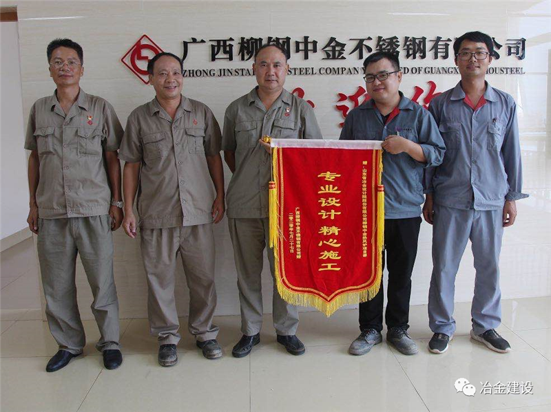 就是憑著這股韌勁和山冶設(shè)計“敢打硬仗、一切為用戶著想”的精神,柳鋼中金熱風(fēng)爐工程的各項工作推進順利,并多次在安全、質(zhì)量、進度大例會上受到表揚。在27日砌筑封頂之后,上午柳鋼中金煉鐵廠送來表揚信,對現(xiàn)場項目部的工作給予了肯定,下午柳鋼中金公司副總經(jīng)理張洪波授予了現(xiàn)場項目部“專業(yè)設(shè)計精心施工”的錦旗,盛贊山冶設(shè)計專業(yè)、敬業(yè)!
