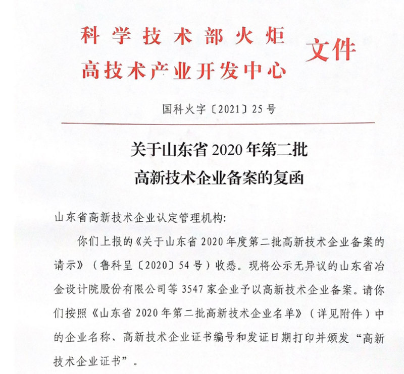 1月15日,根據(jù)全國高新技術企業(yè)認定管理工作領導小組辦公室印發(fā)的《關于山東省2020年第二批高新技術企業(yè)備案的復函》,公司順利通過了2020年度國家高新技術企業(yè)認定。