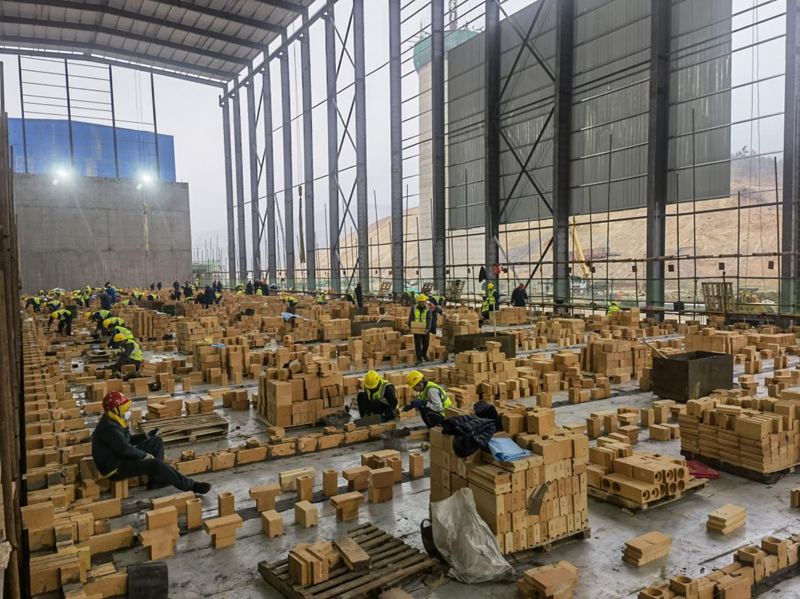 云煤能源焦化升級項目建設(shè)的7.6m頂裝焦?fàn)t,2座焦?fàn)t用磚量7萬噸,磚型多達1000多種,磚型復(fù)雜,對耐材生產(chǎn)供貨及管理要求很高,公司領(lǐng)導(dǎo)在耐材訂貨時就高瞻遠矚十分重視、派遣數(shù)位人員駐廠監(jiān)制,云煤焦?fàn)t砌筑工期十分緊張,加上現(xiàn)階段國內(nèi)新建焦?fàn)t較多耐材供應(yīng)本就較緊張,以及受疫情以及冬奧會影響,生產(chǎn)供應(yīng)更加困難。云煤1#焦?fàn)t砌筑時間與山冶負責(zé)設(shè)計與項目管理的山西盛隆泰達項目砌筑時間相近,且粘土磚生產(chǎn)廠家均包含濟源耐火爐業(yè),粘土磚供應(yīng)保障壓力極大。為了保證砌筑進度,云煤項目部積極協(xié)調(diào)各方、千方百計保證耐材供貨以滿足砌筑需求。一方面派遣專業(yè)工程師駐廠催交監(jiān)制,另一方面協(xié)調(diào)其他耐材生產(chǎn)廠家協(xié)助粘土磚生產(chǎn)保供應(yīng)。項目管理分公司負責(zé)耐材管理的石景林,每天不辭辛苦聯(lián)系廠家發(fā)貨、溝通到貨時間、協(xié)調(diào)施工方卸貨,晚上還要統(tǒng)計每天10~20車數(shù)百個磚號的到貨量。在耐材砌筑質(zhì)量管理方面,我們外聘了2位有豐富施工與砌筑經(jīng)驗的老同志,為焦?fàn)t砌筑施工質(zhì)量保駕護航。
