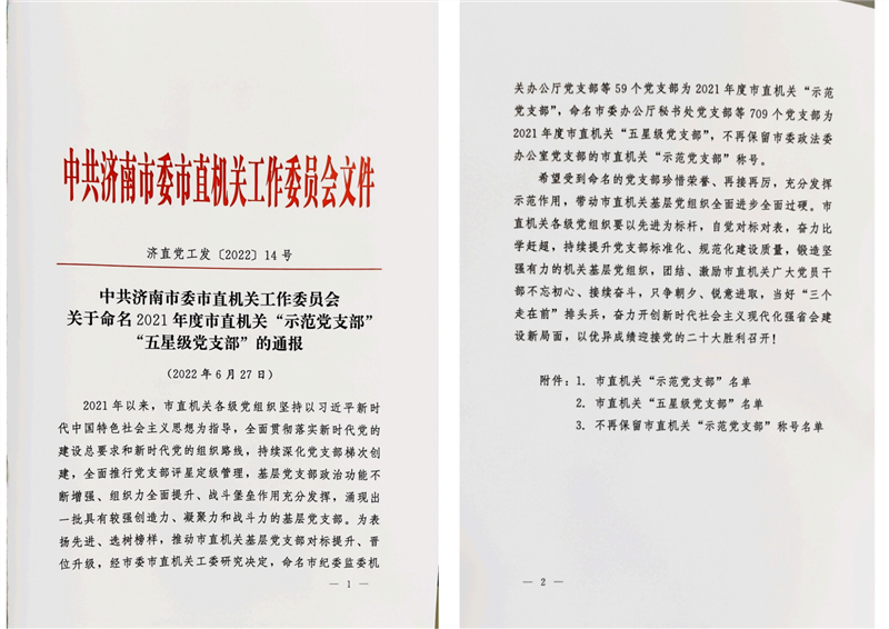 市委市直機(jī)關(guān)工委印發(fā)的《關(guān)于命名2021年度市直機(jī)關(guān)“示范黨支部”、“五星級黨支部”的通報(bào)》(濟(jì)直黨工發(fā)〔2022〕1號文)中,授予我單位熱風(fēng)爐工程技術(shù)分公司黨支部、焦化事業(yè)部黨支部、耀華能源公司黨支部、土建設(shè)計(jì)一部黨支部、土建設(shè)計(jì)二部黨支部、職能管理第一黨支部、公司辦公室黨支部、電氣設(shè)計(jì)部黨支部、經(jīng)營管理黨支部、職能管理第二黨支部共10個黨支部為“五星級黨支部”。獲獎支部將繼續(xù)發(fā)揮示范作用,團(tuán)結(jié)激勵支部黨員,不忘初心、勇于擔(dān)當(dāng),努力為公司發(fā)展做出更大貢獻(xiàn)。