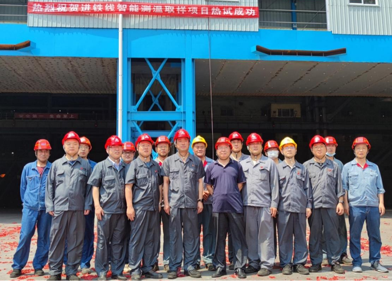 7月1日,在慶祝黨的101周年生日之際,黃海之濱,喜傳捷報(bào),我公司EPC總承包的山鋼日照精品基地鐵水智能快速測溫取樣項(xiàng)目成功熱試!當(dāng)天下午,橫跨煉鋼廠進(jìn)鐵線上方的智能測溫取樣平臺上,三套智能機(jī)器人經(jīng)過前期精心調(diào)教已進(jìn)入最佳狀態(tài),胸有成竹地靜坐在軌道上等待著主人的到來,13時(shí)30分,日照精品基地?zé)掍搹S王經(jīng)理一行來到平臺,詳細(xì)了解設(shè)備安裝、調(diào)試、生產(chǎn)準(zhǔn)備情況,煉鋼廠黨政領(lǐng)導(dǎo)對該項(xiàng)目從設(shè)計(jì)、現(xiàn)場施工、設(shè)備供貨直到智能調(diào)試,給予高度評價(jià),對總包方的出色表現(xiàn)予以充分肯定,并向我公司送交了表揚(yáng)信。王經(jīng)理一聲令下,銀裝素裹的機(jī)器人起步行走,準(zhǔn)確來到取樣窗口,熟練地展開鋼鐵長臂,下探、取樣、回臂、卸樣、丟桿、復(fù)位,現(xiàn)場響起熱烈的掌聲,熱試成功!然后現(xiàn)場舉行了熱烈的慶祝儀式,煉鋼廠黨政領(lǐng)導(dǎo)與參戰(zhàn)各方合影留念。