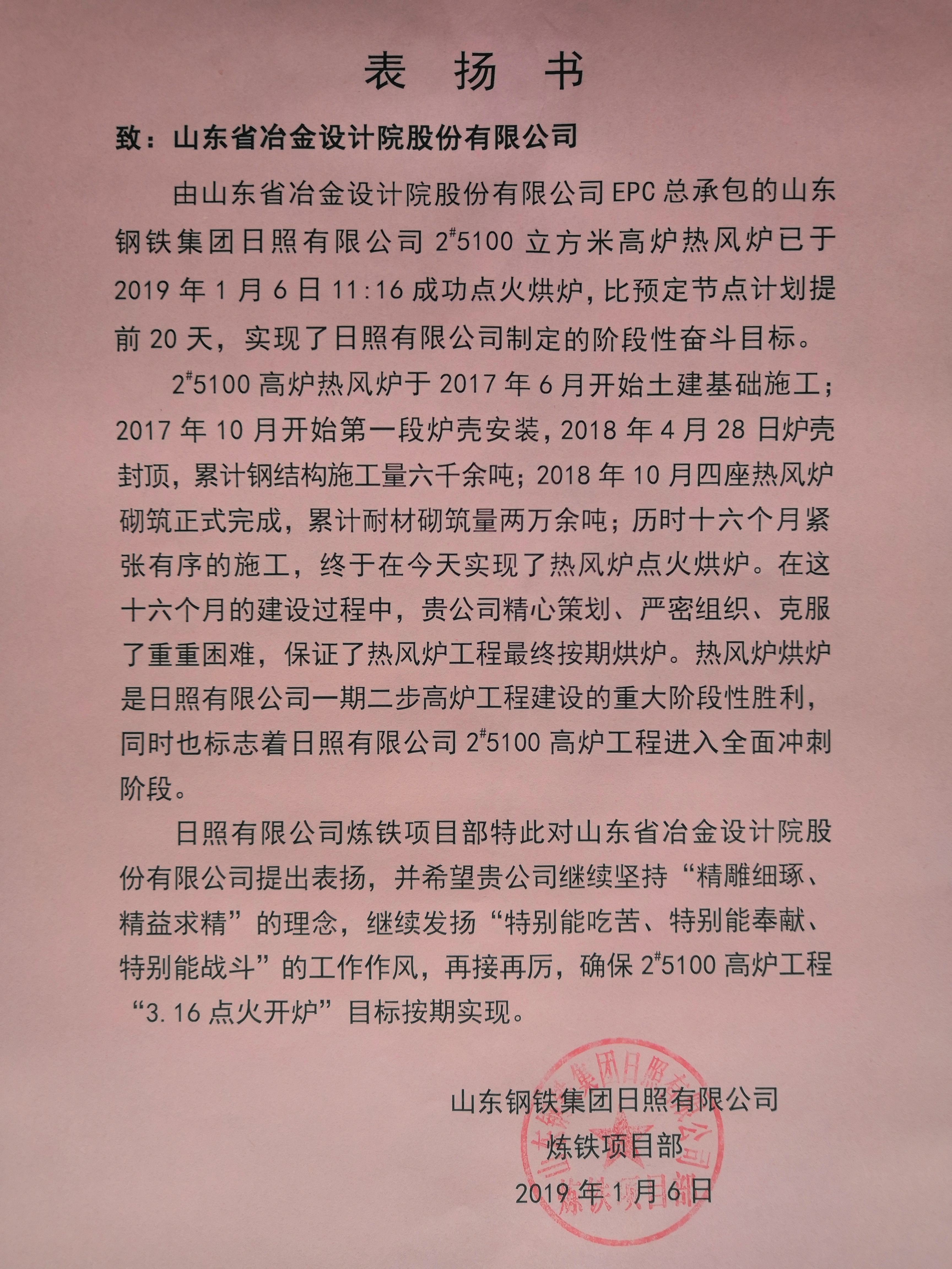 2019年1月6日11時(shí)16分,隨著山鋼集團(tuán)日照公司副總經(jīng)理王子金:“我宣布山東鋼鐵集團(tuán)日照精品基地2#5100立方米高爐熱風(fēng)爐點(diǎn)火烘爐開始”的號(hào)令, 由我公司總包的山鋼集團(tuán)日照精品基地2#5100立方米高爐熱風(fēng)爐正式點(diǎn)火烘爐。這標(biāo)志由公司總承包2#5100立方米高爐工程熱風(fēng)爐烘爐的重大節(jié)點(diǎn)比計(jì)劃提前20天實(shí)現(xiàn)階段性奮斗目標(biāo)。公司副總經(jīng)理劉洪亮參加烘爐儀式并發(fā)表了講話。當(dāng)天,山東鋼鐵集團(tuán)日照有限公司向公司發(fā)來了表揚(yáng)書,贊揚(yáng)山冶人堅(jiān)持“精雕細(xì)琢、精益求精”的理念,希望再接再厲確保后續(xù)工作目標(biāo)如期實(shí)現(xiàn)。