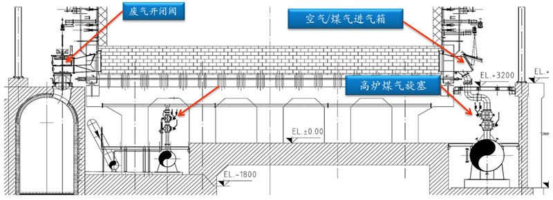 廢氣開(kāi)閉器及煙道布置在焦?fàn)t焦側(cè),混合煤氣及空氣導(dǎo)入裝置布置在焦?fàn)t機(jī)側(cè),便于調(diào)節(jié)從機(jī)側(cè)到焦側(cè)各立火道煤氣流和空氣流,且便于廢氣流的排出,有利于焦?fàn)t長(zhǎng)向加熱的均勻性。