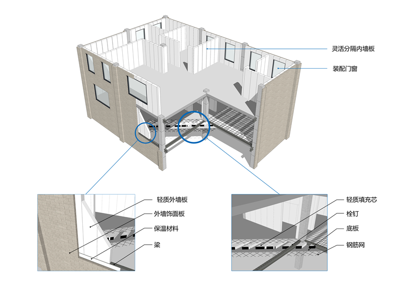 隱梁裝配式鋼結(jié)構(gòu)建筑集成體系:以建筑功能為核心,以結(jié)構(gòu)布置為基礎(chǔ),以工業(yè)化的圍護(hù)、內(nèi)裝和設(shè)備管線部件為支撐,綜合考慮建筑布局、外立面、結(jié)構(gòu)體系、圍護(hù)結(jié)構(gòu)、設(shè)備管線、構(gòu)件防護(hù)、內(nèi)裝等各方面的協(xié)同與集成,實(shí)現(xiàn)了主體鋼結(jié)構(gòu)系統(tǒng)、外圍護(hù)系統(tǒng)、設(shè)備管線系統(tǒng)、內(nèi)裝系統(tǒng)協(xié)同,將鋼梁隱藏于樓板或墻體內(nèi),避免鋼結(jié)構(gòu)外露對(duì)使用功能的影響,解決了鋼結(jié)構(gòu)防腐、防火問(wèn)題,同時(shí)還發(fā)揮出了裝配式鋼結(jié)構(gòu)建筑在大空間靈活分隔方面的優(yōu)勢(shì)。