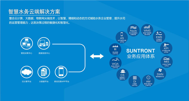 智慧水務(wù):基于地理信息系統(tǒng)(GIS)、物聯(lián)網(wǎng)和云計(jì)算技術(shù),打造智慧污水系統(tǒng)平臺(tái),為污水運(yùn)營(yíng)企業(yè)安全管理、生產(chǎn)運(yùn)行、水質(zhì)化驗(yàn)、設(shè)備管理、日常辦公等關(guān)鍵業(yè)務(wù)提供統(tǒng)一業(yè)務(wù)信息管理平臺(tái),對(duì)企業(yè)實(shí)時(shí)生產(chǎn)數(shù)據(jù)、視頻監(jiān)控?cái)?shù)據(jù)、工藝設(shè)計(jì)、日常管理等相關(guān)數(shù)據(jù)進(jìn)行集中管理、統(tǒng)計(jì)分析、數(shù)據(jù)挖掘,為不同層面的生產(chǎn)運(yùn)行管理者提供即時(shí)、豐富的生產(chǎn)運(yùn)行信息,為輔助分析決策奠定良好的基礎(chǔ),為企業(yè)規(guī)范管理、節(jié)能降耗、減員增效和精細(xì)化管理提供強(qiáng)大的技術(shù)支持。